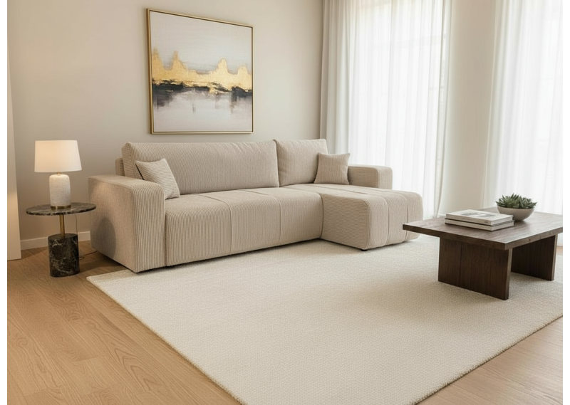 🛋️ Canapé d’angle convertible, velours côtelé, dimensions compactes (240 x 150 cm) idéal pour petits espaces.